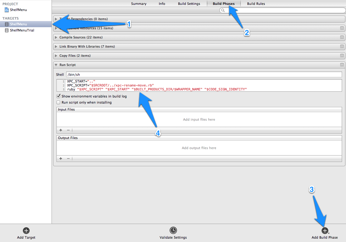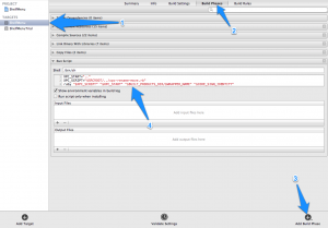 Next you need to add a step to the compile process, in Xcode. Easier seen than explained, have a look at the following screenshot.