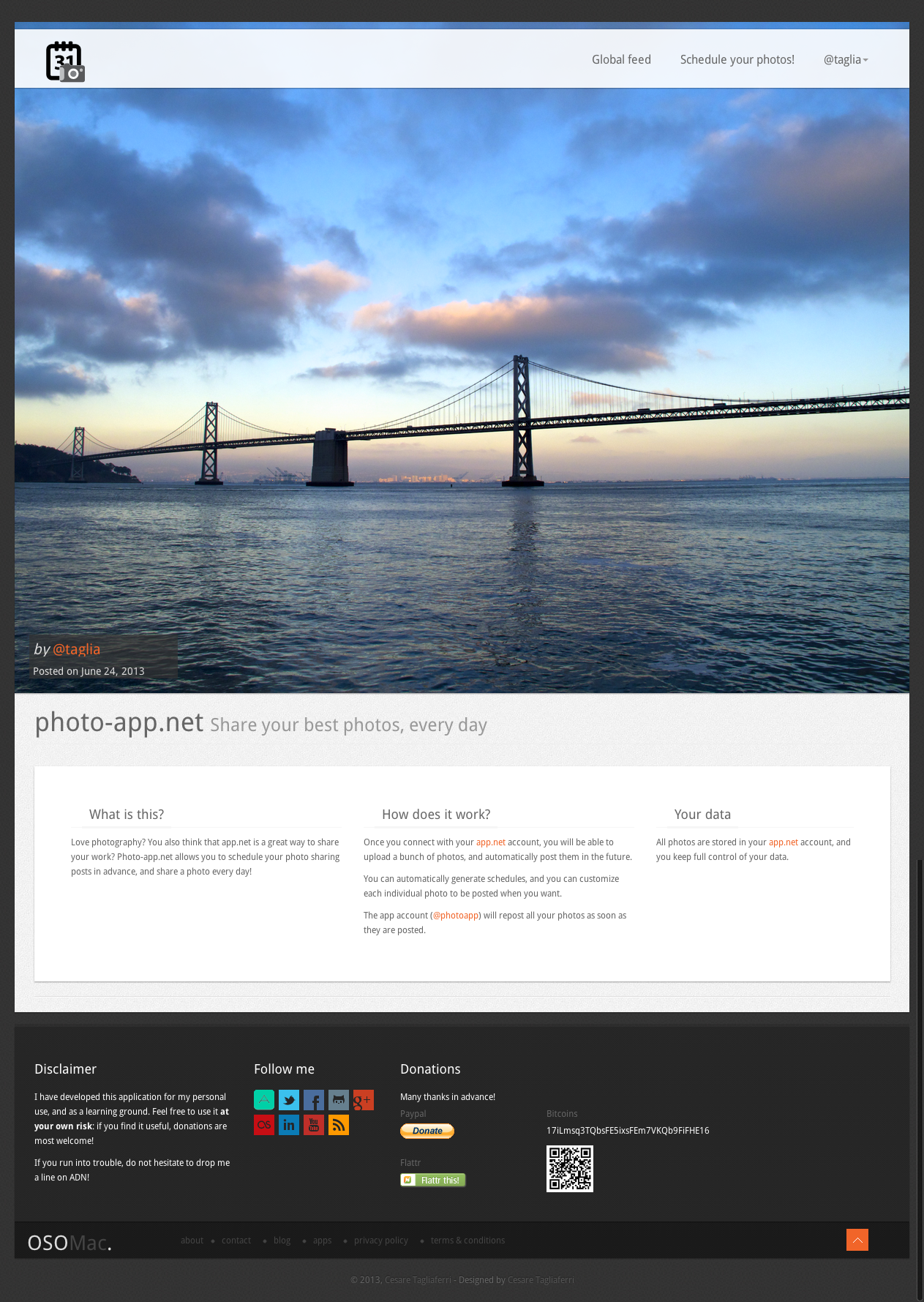 App.net is my favorite social network, and I really like the way it allows you to upload photos and present them in a simple lightbox. Photo-app allows you to share your work progressively, without having to remember adding new photos every day.